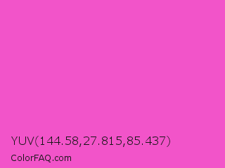 YUV 144.58,27.815,85.437 Color is a light magenta color and the nearest color is Light Deep Pink #ff5ccd. Hex code #f254c9 and RGB value is rgb(242,84,201). In RGB color space, this color is composed of 95% red, 33% green, 79% blue, In CMYK color space, this color is composed of 0% cyan, 65% magenta, 17% yellow , 5% black , In HSL color space, this color has a hue angle of 316° , 86% saturation and 64% lightness.