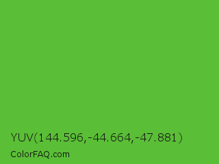 YUV 144.596,-44.664,-47.881 Color is a normal green color and the nearest color is Green RYB #66b032. Hex code #5abe36 and RGB value is rgb(90,190,54). In RGB color space, this color is composed of 35% red, 75% green, 21% blue, In CMYK color space, this color is composed of 53% cyan, 0% magenta, 72% yellow , 25% black , In HSL color space, this color has a hue angle of 104° , 56% saturation and 48% lightness.