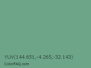 YUV 144.651,-4.265,-32.143 Color is a normal green color and the nearest color is Oxley #779e86. Hex code #6ca588 and RGB value is rgb(108,165,136). In RGB color space, this color is composed of 42% red, 65% green, 53% blue, In CMYK color space, this color is composed of 35% cyan, 0% magenta, 18% yellow , 35% black , In HSL color space, this color has a hue angle of 149° , 24% saturation and 54% lightness.