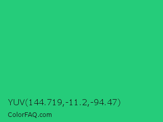 YUV 144.719,-11.2,-94.47 Color is a normal green color and the nearest color is UFO Green #3cd070. Hex code #25cc7a and RGB value is rgb(37,204,122). In RGB color space, this color is composed of 15% red, 80% green, 48% blue, In CMYK color space, this color is composed of 82% cyan, 0% magenta, 40% yellow , 20% black , In HSL color space, this color has a hue angle of 151° , 69% saturation and 47% lightness.