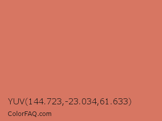 YUV 144.723,-23.034,61.633 Color is a light red color and the nearest color is Japonica #d87c63. Hex code #d77662 and RGB value is rgb(215,118,98). In RGB color space, this color is composed of 84% red, 46% green, 38% blue, In CMYK color space, this color is composed of 0% cyan, 45% magenta, 54% yellow , 16% black , In HSL color space, this color has a hue angle of 10° , 59% saturation and 61% lightness.