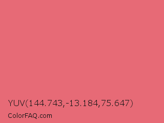 YUV 144.743,-13.184,75.647 Color is a light red color and the nearest color is Light Carmine Pink #e66771. Hex code #e76a76 and RGB value is rgb(231,106,118). In RGB color space, this color is composed of 91% red, 42% green, 46% blue, In CMYK color space, this color is composed of 0% cyan, 54% magenta, 49% yellow , 9% black , In HSL color space, this color has a hue angle of 354° , 72% saturation and 66% lightness.