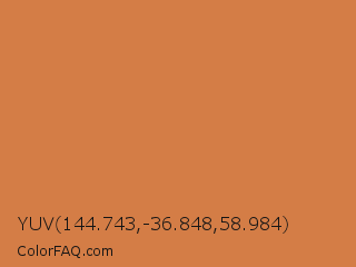 YUV 144.743,-36.848,58.984 Color is a normal orange color and the nearest color is Raw Sienna Crayola #d27d46. Hex code #d47d46 and RGB value is rgb(212,125,70). In RGB color space, this color is composed of 83% red, 49% green, 27% blue, In CMYK color space, this color is composed of 0% cyan, 41% magenta, 67% yellow , 17% black , In HSL color space, this color has a hue angle of 23° , 62% saturation and 55% lightness.