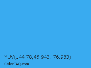 YUV 144.78,46.943,-76.983 Color is a normal blue color and the nearest color is Picton Blue #45b1e8. Hex code #39abf0 and RGB value is rgb(57,171,240). In RGB color space, this color is composed of 22% red, 67% green, 94% blue, In CMYK color space, this color is composed of 76% cyan, 29% magenta, 0% yellow , 6% black , In HSL color space, this color has a hue angle of 203° , 86% saturation and 58% lightness.