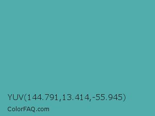 YUV 144.791,13.414,-55.945 Color is a normal cyan color and the nearest color is Tradewind #5fb3ac. Hex code #51acac and RGB value is rgb(81,172,172). In RGB color space, this color is composed of 32% red, 67% green, 67% blue, In CMYK color space, this color is composed of 53% cyan, 0% magenta, 0% yellow , 33% black , In HSL color space, this color has a hue angle of 180° , 36% saturation and 50% lightness.