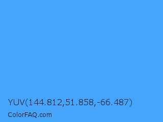 YUV 144.812,51.858,-66.487 Color is a light blue color and the nearest color is Brilliant Azure #3399ff. Hex code #45a3fa and RGB value is rgb(69,163,250). In RGB color space, this color is composed of 27% red, 64% green, 98% blue, In CMYK color space, this color is composed of 72% cyan, 35% magenta, 0% yellow , 2% black , In HSL color space, this color has a hue angle of 209° , 95% saturation and 63% lightness.
