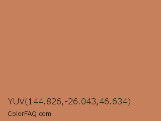 YUV 144.826,-26.043,46.634 Color is a normal orange color and the nearest color is Antique Brass #c88a65. Hex code #c6805c and RGB value is rgb(198,128,92). In RGB color space, this color is composed of 78% red, 50% green, 36% blue, In CMYK color space, this color is composed of 0% cyan, 35% magenta, 54% yellow , 22% black , In HSL color space, this color has a hue angle of 20° , 48% saturation and 57% lightness.