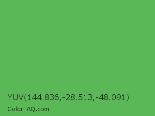 YUV 144.836,-28.513,-48.091 Color is a normal green color and the nearest color is Fern #63b76c. Hex code #5ab857 and RGB value is rgb(90,184,87). In RGB color space, this color is composed of 35% red, 72% green, 34% blue, In CMYK color space, this color is composed of 51% cyan, 0% magenta, 53% yellow , 28% black , In HSL color space, this color has a hue angle of 118° , 41% saturation and 53% lightness.