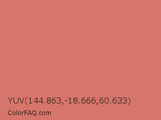 YUV 144.863,-18.666,60.633 Color is a light red color and the nearest color is Japonica #d87c63. Hex code #d6756b and RGB value is rgb(214,117,107). In RGB color space, this color is composed of 84% red, 46% green, 42% blue, In CMYK color space, this color is composed of 0% cyan, 45% magenta, 50% yellow , 16% black , In HSL color space, this color has a hue angle of 6° , 57% saturation and 63% lightness.