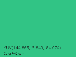 YUV 144.865,-5.849,-84.074 Color is a normal green color and the nearest color is Mountain Meadow #30ba8f. Hex code #31c485 and RGB value is rgb(49,196,133). In RGB color space, this color is composed of 19% red, 77% green, 52% blue, In CMYK color space, this color is composed of 75% cyan, 0% magenta, 32% yellow , 23% black , In HSL color space, this color has a hue angle of 154° , 60% saturation and 48% lightness.
