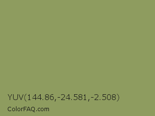 YUV 144.86,-24.581,-2.508 Color is a normal lime color and the nearest color is Moss Green #8a9a5b. Hex code #8e9c5f and RGB value is rgb(142,156,95). In RGB color space, this color is composed of 56% red, 61% green, 37% blue, In CMYK color space, this color is composed of 9% cyan, 0% magenta, 39% yellow , 39% black , In HSL color space, this color has a hue angle of 74° , 24% saturation and 49% lightness.