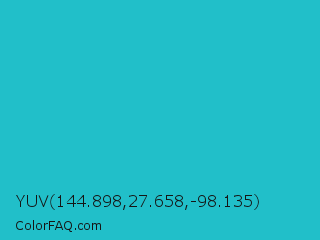 YUV 144.898,27.658,-98.135 Color is a normal cyan color and the nearest color is Java #1fc2c2. Hex code #21bfc9 and RGB value is rgb(33,191,201). In RGB color space, this color is composed of 13% red, 75% green, 79% blue, In CMYK color space, this color is composed of 84% cyan, 5% magenta, 0% yellow , 21% black , In HSL color space, this color has a hue angle of 184° , 72% saturation and 46% lightness.
