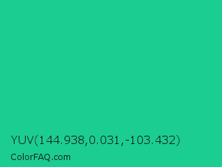 YUV 144.938,0.031,-103.432 Color is a normal green color and the nearest color is Shamrock #33cc99. Hex code #1bcd91 and RGB value is rgb(27,205,145). In RGB color space, this color is composed of 11% red, 80% green, 57% blue, In CMYK color space, this color is composed of 87% cyan, 0% magenta, 29% yellow , 20% black , In HSL color space, this color has a hue angle of 160° , 77% saturation and 45% lightness.