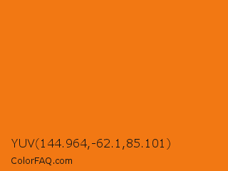 YUV 144.964,-62.1,85.101 Color is a normal orange color and the nearest color is Ecstasy #fa7814. Hex code #f27813 and RGB value is rgb(242,120,19). In RGB color space, this color is composed of 95% red, 47% green, 7% blue, In CMYK color space, this color is composed of 0% cyan, 50% magenta, 92% yellow , 5% black , In HSL color space, this color has a hue angle of 27° , 90% saturation and 51% lightness.