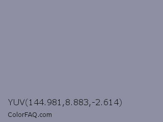 YUV 144.981,8.883,-2.614 Color is a normal blue color and the nearest color is Manatee Crayola #8d90a1. Hex code #8e8fa3 and RGB value is rgb(142,143,163). In RGB color space, this color is composed of 56% red, 56% green, 64% blue, In CMYK color space, this color is composed of 13% cyan, 12% magenta, 0% yellow , 36% black , In HSL color space, this color has a hue angle of 237° , 10% saturation and 60% lightness.