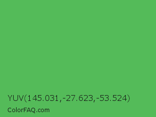 YUV 145.031,-27.623,-53.524 Color is a normal green color and the nearest color is Fern #63b76c. Hex code #54bb59 and RGB value is rgb(84,187,89). In RGB color space, this color is composed of 33% red, 73% green, 35% blue, In CMYK color space, this color is composed of 55% cyan, 0% magenta, 52% yellow , 27% black , In HSL color space, this color has a hue angle of 123° , 43% saturation and 53% lightness.