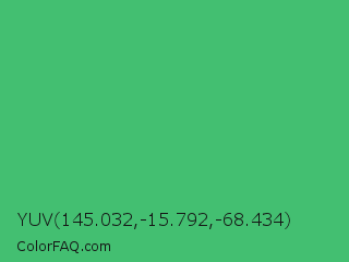 YUV 145.032,-15.792,-68.434 Color is a normal green color and the nearest color is Medium Sea Green #3cb371. Hex code #43bf71 and RGB value is rgb(67,191,113). In RGB color space, this color is composed of 26% red, 75% green, 44% blue, In CMYK color space, this color is composed of 65% cyan, 0% magenta, 41% yellow , 25% black , In HSL color space, this color has a hue angle of 142° , 49% saturation and 51% lightness.