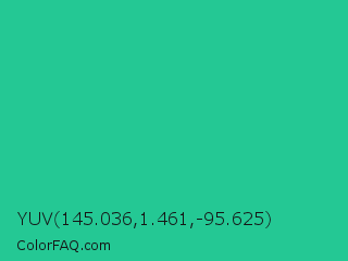 YUV 145.036,1.461,-95.625 Color is a normal green color and the nearest color is Shamrock #33cc99. Hex code #24c894 and RGB value is rgb(36,200,148). In RGB color space, this color is composed of 14% red, 78% green, 58% blue, In CMYK color space, this color is composed of 82% cyan, 0% magenta, 26% yellow , 22% black , In HSL color space, this color has a hue angle of 161° , 69% saturation and 46% lightness.