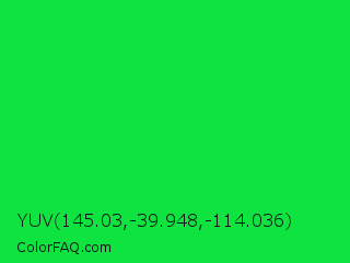 YUV 145.03,-39.948,-114.036 Color is a normal green color and the nearest color is Malachite #0bda51. Hex code #0fe340 and RGB value is rgb(15,227,64). In RGB color space, this color is composed of 6% red, 89% green, 25% blue, In CMYK color space, this color is composed of 93% cyan, 0% magenta, 72% yellow , 11% black , In HSL color space, this color has a hue angle of 134° , 88% saturation and 47% lightness.