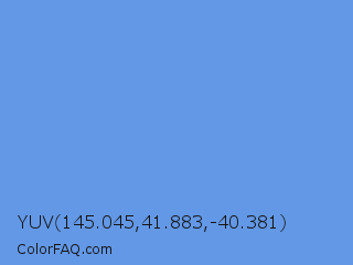 YUV 145.045,41.883,-40.381 Color is a light blue color and the nearest color is Cornflower Blue #6495ed. Hex code #6398e6 and RGB value is rgb(99,152,230). In RGB color space, this color is composed of 39% red, 60% green, 90% blue, In CMYK color space, this color is composed of 57% cyan, 34% magenta, 0% yellow , 10% black , In HSL color space, this color has a hue angle of 216° , 72% saturation and 65% lightness.