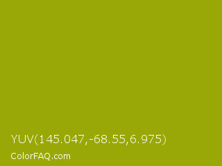 YUV 145.047,-68.55,6.975 Color is a normal yellow color and the nearest color is Apple Green #8db600. Hex code #99a806 and RGB value is rgb(153,168,6). In RGB color space, this color is composed of 60% red, 66% green, 2% blue, In CMYK color space, this color is composed of 9% cyan, 0% magenta, 96% yellow , 34% black , In HSL color space, this color has a hue angle of 66° , 93% saturation and 34% lightness.
