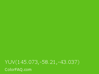 YUV 145.073,-58.21,-43.037 Color is a normal green color and the nearest color is Kelly Green #4cbb17. Hex code #60c11b and RGB value is rgb(96,193,27). In RGB color space, this color is composed of 38% red, 76% green, 11% blue, In CMYK color space, this color is composed of 50% cyan, 0% magenta, 86% yellow , 24% black , In HSL color space, this color has a hue angle of 95° , 75% saturation and 43% lightness.