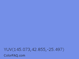 YUV 145.073,42.855,-25.497 Color is a light blue color and the nearest color is Cornflower Blue #6495ed. Hex code #748fe8 and RGB value is rgb(116,143,232). In RGB color space, this color is composed of 45% red, 56% green, 91% blue, In CMYK color space, this color is composed of 50% cyan, 38% magenta, 0% yellow , 9% black , In HSL color space, this color has a hue angle of 226° , 72% saturation and 68% lightness.
