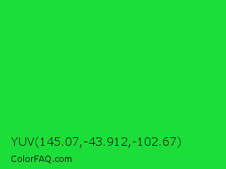 YUV 145.07,-43.912,-102.67 Color is a normal green color and the nearest color is Lime Green #32cd32. Hex code #1cde38 and RGB value is rgb(28,222,56). In RGB color space, this color is composed of 11% red, 87% green, 22% blue, In CMYK color space, this color is composed of 87% cyan, 0% magenta, 75% yellow , 13% black , In HSL color space, this color has a hue angle of 129° , 78% saturation and 49% lightness.