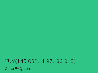 YUV 145.082,-4.97,-86.018 Color is a normal green color and the nearest color is Mountain Meadow #30ba8f. Hex code #2fc587 and RGB value is rgb(47,197,135). In RGB color space, this color is composed of 18% red, 77% green, 53% blue, In CMYK color space, this color is composed of 76% cyan, 0% magenta, 31% yellow , 23% black , In HSL color space, this color has a hue angle of 155° , 61% saturation and 48% lightness.