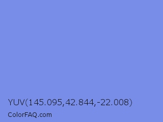 YUV 145.095,42.844,-22.008 Color is a light blue color and the nearest color is Cornflower Blue #6495ed. Hex code #788de8 and RGB value is rgb(120,141,232). In RGB color space, this color is composed of 47% red, 55% green, 91% blue, In CMYK color space, this color is composed of 48% cyan, 39% magenta, 0% yellow , 9% black , In HSL color space, this color has a hue angle of 229° , 71% saturation and 69% lightness.