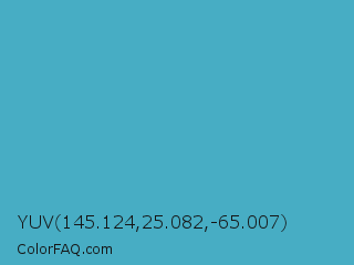 YUV 145.124,25.082,-65.007 Color is a normal cyan color and the nearest color is Maximum Blue #47abcc. Hex code #47adc4 and RGB value is rgb(71,173,196). In RGB color space, this color is composed of 28% red, 68% green, 77% blue, In CMYK color space, this color is composed of 64% cyan, 12% magenta, 0% yellow , 23% black , In HSL color space, this color has a hue angle of 191° , 51% saturation and 52% lightness.