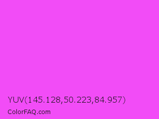 YUV 145.128,50.223,84.957 Color is a light magenta color and the nearest color is Pink Flamingo Crayola #ff66ff. Hex code #f24cf7 and RGB value is rgb(242,76,247). In RGB color space, this color is composed of 95% red, 30% green, 97% blue, In CMYK color space, this color is composed of 2% cyan, 69% magenta, 0% yellow , 3% black , In HSL color space, this color has a hue angle of 298° , 91% saturation and 63% lightness.