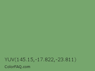 YUV 145.15,-17.822,-23.811 Color is a normal green color and the nearest color is Asparagus #87a96b. Hex code #76a66d and RGB value is rgb(118,166,109). In RGB color space, this color is composed of 46% red, 65% green, 43% blue, In CMYK color space, this color is composed of 29% cyan, 0% magenta, 34% yellow , 35% black , In HSL color space, this color has a hue angle of 111° , 24% saturation and 54% lightness.