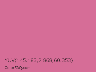 YUV 145.183,2.868,60.353 Color is a light rose color and the nearest color is Pale Red Violet #db7093. Hex code #d66d97 and RGB value is rgb(214,109,151). In RGB color space, this color is composed of 84% red, 43% green, 59% blue, In CMYK color space, this color is composed of 0% cyan, 49% magenta, 29% yellow , 16% black , In HSL color space, this color has a hue angle of 336° , 56% saturation and 63% lightness.