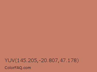 YUV 145.205,-20.807,47.178 Color is a normal red color and the nearest color is Antique Brass #c88a65. Hex code #c77e67 and RGB value is rgb(199,126,103). In RGB color space, this color is composed of 78% red, 49% green, 40% blue, In CMYK color space, this color is composed of 0% cyan, 37% magenta, 48% yellow , 22% black , In HSL color space, this color has a hue angle of 14° , 46% saturation and 59% lightness.