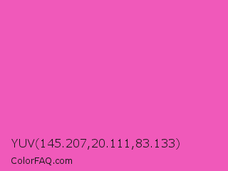 YUV 145.207,20.111,83.133 Color is a light magenta color and the nearest color is Brilliant Rose #f653a6. Hex code #f059ba and RGB value is rgb(240,89,186). In RGB color space, this color is composed of 94% red, 35% green, 73% blue, In CMYK color space, this color is composed of 0% cyan, 63% magenta, 23% yellow , 6% black , In HSL color space, this color has a hue angle of 321° , 83% saturation and 65% lightness.
