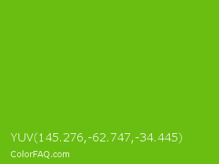 YUV 145.276,-62.747,-34.445 Color is a normal green color and the nearest color is Lima #76bd17. Hex code #6abe12 and RGB value is rgb(106,190,18). In RGB color space, this color is composed of 42% red, 75% green, 7% blue, In CMYK color space, this color is composed of 44% cyan, 0% magenta, 91% yellow , 25% black , In HSL color space, this color has a hue angle of 89° , 83% saturation and 41% lightness.