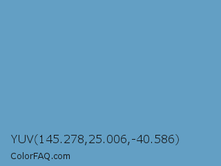 YUV 145.278,25.006,-40.586 Color is a normal blue color and the nearest color is Blue Gray #6699cc. Hex code #639fc4 and RGB value is rgb(99,159,196). In RGB color space, this color is composed of 39% red, 62% green, 77% blue, In CMYK color space, this color is composed of 49% cyan, 19% magenta, 0% yellow , 23% black , In HSL color space, this color has a hue angle of 203° , 45% saturation and 58% lightness.