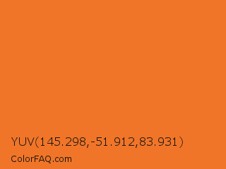 YUV 145.298,-51.912,83.931 Color is a normal orange color and the nearest color is Vivid Tangelo #f07427. Hex code #f17528 and RGB value is rgb(241,117,40). In RGB color space, this color is composed of 95% red, 46% green, 16% blue, In CMYK color space, this color is composed of 0% cyan, 51% magenta, 83% yellow , 5% black , In HSL color space, this color has a hue angle of 23° , 88% saturation and 55% lightness.