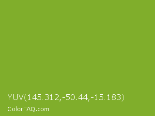 YUV 145.312,-50.44,-15.183 Color is a normal green color and the nearest color is Sushi #87ab39. Hex code #80ae2b and RGB value is rgb(128,174,43). In RGB color space, this color is composed of 50% red, 68% green, 17% blue, In CMYK color space, this color is composed of 26% cyan, 0% magenta, 75% yellow , 32% black , In HSL color space, this color has a hue angle of 81° , 60% saturation and 43% lightness.