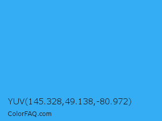 YUV 145.328,49.138,-80.972 Color is a normal blue color and the nearest color is Picton Blue #45b1e8. Hex code #35adf5 and RGB value is rgb(53,173,245). In RGB color space, this color is composed of 21% red, 68% green, 96% blue, In CMYK color space, this color is composed of 78% cyan, 29% magenta, 0% yellow , 4% black , In HSL color space, this color has a hue angle of 203° , 91% saturation and 58% lightness.