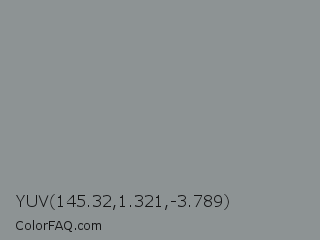 YUV 145.32,1.321,-3.789 Color is a normal cyan color and the nearest color is Mountain Mist #959396. Hex code #8d9394 and RGB value is rgb(141,147,148). In RGB color space, this color is composed of 55% red, 58% green, 58% blue, In CMYK color space, this color is composed of 5% cyan, 1% magenta, 0% yellow , 42% black , In HSL color space, this color has a hue angle of 189° , 3% saturation and 57% lightness.