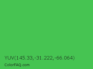 YUV 145.33,-31.222,-66.064 Color is a normal green color and the nearest color is Chateau Green #40a860. Hex code #46c452 and RGB value is rgb(70,196,82). In RGB color space, this color is composed of 27% red, 77% green, 32% blue, In CMYK color space, this color is composed of 64% cyan, 0% magenta, 58% yellow , 23% black , In HSL color space, this color has a hue angle of 126° , 52% saturation and 52% lightness.