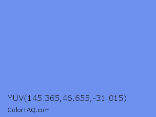 YUV 145.365,46.655,-31.015 Color is a light blue color and the nearest color is Cornflower Blue #6495ed. Hex code #6e91f0 and RGB value is rgb(110,145,240). In RGB color space, this color is composed of 43% red, 57% green, 94% blue, In CMYK color space, this color is composed of 54% cyan, 40% magenta, 0% yellow , 6% black , In HSL color space, this color has a hue angle of 224° , 81% saturation and 69% lightness.