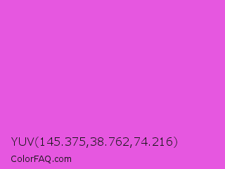 YUV 145.375,38.762,74.216 Color is a light magenta color and the nearest color is Purple Pizzazz #fe4eda. Hex code #e657e0 and RGB value is rgb(230,87,224). In RGB color space, this color is composed of 90% red, 34% green, 88% blue, In CMYK color space, this color is composed of 0% cyan, 62% magenta, 3% yellow , 10% black , In HSL color space, this color has a hue angle of 303° , 74% saturation and 62% lightness.