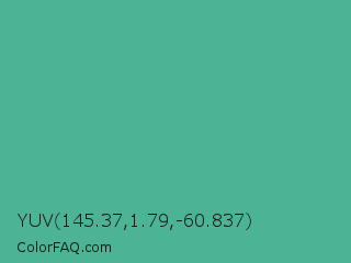 YUV 145.37,1.79,-60.837 Color is a normal green color and the nearest color is Ocean Green #48bf91. Hex code #4cb495 and RGB value is rgb(76,180,149). In RGB color space, this color is composed of 30% red, 71% green, 58% blue, In CMYK color space, this color is composed of 58% cyan, 0% magenta, 17% yellow , 29% black , In HSL color space, this color has a hue angle of 162° , 41% saturation and 50% lightness.