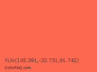 YUV 145.391,-32.731,91.742 Color is a light red color and the nearest color is Persimmon #ff6b53. Hex code #fa694f and RGB value is rgb(250,105,79). In RGB color space, this color is composed of 98% red, 41% green, 31% blue, In CMYK color space, this color is composed of 0% cyan, 58% magenta, 68% yellow , 2% black , In HSL color space, this color has a hue angle of 9° , 94% saturation and 65% lightness.