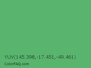 YUV 145.398,-17.451,-49.461 Color is a normal green color and the nearest color is Fern #63b76c. Hex code #59b56e and RGB value is rgb(89,181,110). In RGB color space, this color is composed of 35% red, 71% green, 43% blue, In CMYK color space, this color is composed of 51% cyan, 0% magenta, 39% yellow , 29% black , In HSL color space, this color has a hue angle of 134° , 38% saturation and 53% lightness.