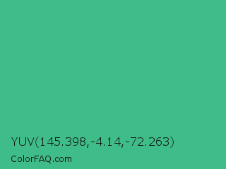 YUV 145.398,-4.14,-72.263 Color is a normal green color and the nearest color is Mint #3eb489. Hex code #3fbd89 and RGB value is rgb(63,189,137). In RGB color space, this color is composed of 25% red, 74% green, 54% blue, In CMYK color space, this color is composed of 67% cyan, 0% magenta, 28% yellow , 26% black , In HSL color space, this color has a hue angle of 155° , 50% saturation and 49% lightness.