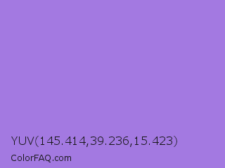 YUV 145.414,39.236,15.423 Color is a light violet color and the nearest color is Lilac Bush #9874d3. Hex code #a379e1 and RGB value is rgb(163,121,225). In RGB color space, this color is composed of 64% red, 47% green, 88% blue, In CMYK color space, this color is composed of 28% cyan, 46% magenta, 0% yellow , 12% black , In HSL color space, this color has a hue angle of 264° , 63% saturation and 68% lightness.